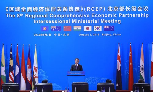 Chinese Vice Premier Hu Chunhua, also a member of the Political Bureau of the Communist Party of China (CPC) Central Committee, delivers a speech at the opening ceremony of the Regional Comprehensive Economic Partnership (RCEP) ministerial conference in Beijing, capital of China, Aug. 3, 2019. (Xinhua/Liu Bin)