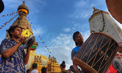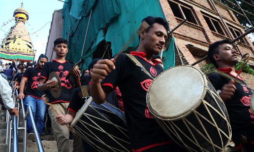 Local people play traditional music in celebration of the month-long Gunla festival at Swayambhunath in Kathmandu, Nepal, Aug. 2, 2019. The month-long Gunla festival is one of the major festivals of the Newar Buddhist community during which they recite scriptures, observe fast and visit places of worship playing devotional music. (Xinhua/Sunil Sharma)