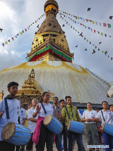 Local people celebrate the month-long Gunla festival at Swayambhunath in Kathmandu, Nepal, Aug. 2, 2019. The month-long Gunla festival is one of the major festivals of the Newar Buddhist community during which they recite scriptures, observe fast and visit places of worship playing devotional music. (Xinhua/Sunil Sharma)