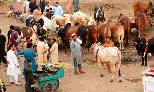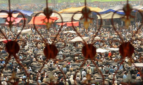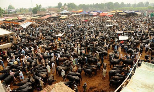 People trade at a livestock market ahead of Eid al-Adha festival in northwest Pakistan's Peshawar on Aug. 2, 2019. (Photo by Saeed Ahmad/Xinhua)