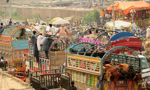 People transport their livestock on trucks at a livestock market ahead of Eid al-Adha festival in northwest Pakistan's Peshawar on Aug. 2, 2019. (Photo by Saeed Ahmad/Xinhua)