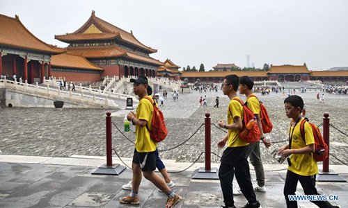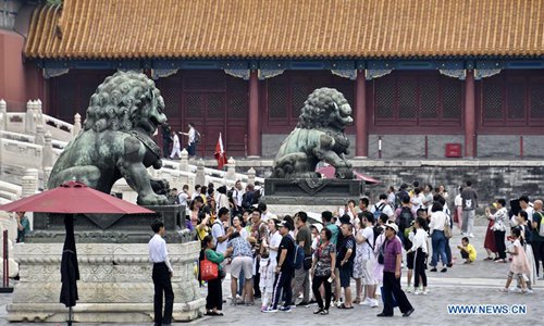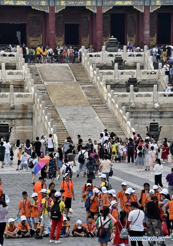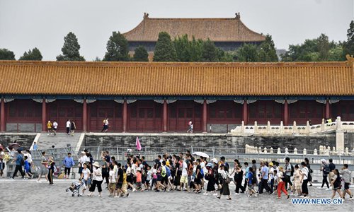 Tourists visit the Palace Museum in Beijing, capital of China, Aug. 3, 2019. The Palace Museum has taken measures to improve visitor experience during the peak season in summer. These include setting a limit to the number of visitors per day, diverting visitor flows, securing water supply, and providing medical services. (Xinhua/Li Xin)