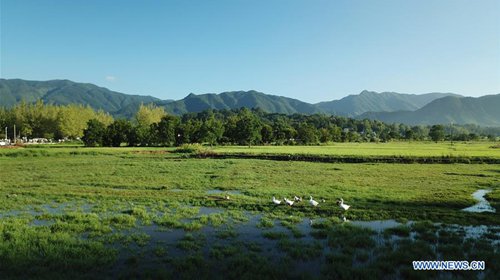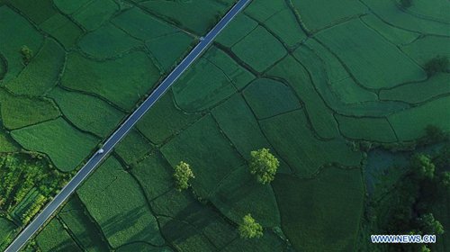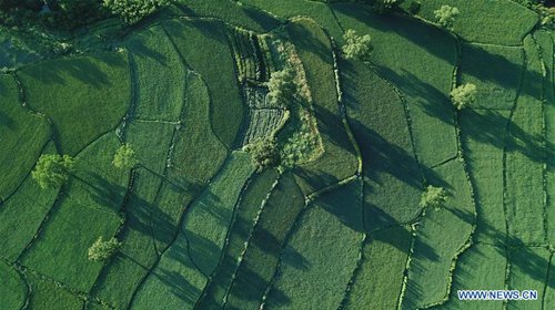Aerial photo taken on Aug. 4, 2019 shows fields near the Hongcun scenic spot in Yixian County, east China's Anhui Province. (Photo: Xinhua)
