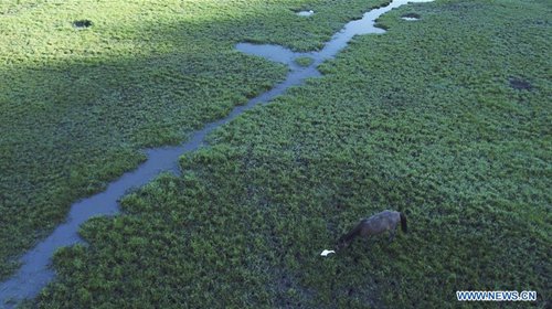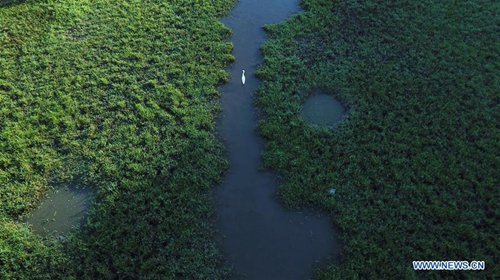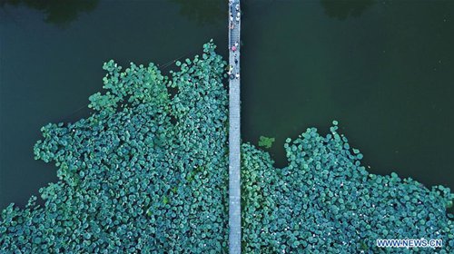 Aerial photo taken on Aug. 4, 2019 shows a lotus pond near the Hongcun scenic spot in Yixian County, east China's Anhui Province. (Photo: Xinhua)