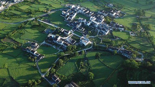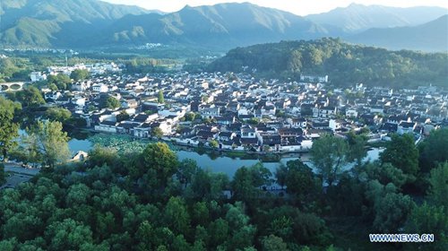 Aerial photo taken on Aug. 4, 2019 shows a village near the Hongcun scenic spot in Yixian County, east China's Anhui Province. (Photo: Xinhua)