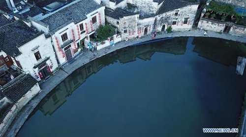 Aerial photo taken on Aug. 4, 2019 shows people visiting the Hongcun scenic spot in Yixian County, east China's Anhui Province.(Photo: Xinhua)