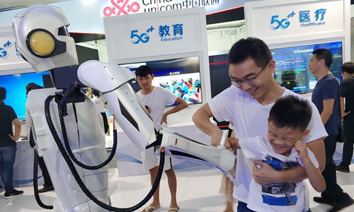 A child interacts with a robot at the Futian high-speed railway station in Shenzhen, South China's Guangdong Province on Sunday. A week-long 5G experience event, jointly held by companies including China Mobile, China Telecom, China Unicom, Shenzhen Metro, Huawei and ZTE, is taking place at the station. Photo: VCG