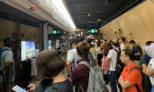 Local residents wait on the platform of Sheung Wan subway station as the strike on Monday morning seriously disrupted public transport. Photo: Chen Qingqing/GT