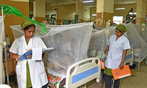 Medical workers check on dengue patients at a hospital in Dhaka, Bangladesh, on July 24, 2019. (Str/Xinhua)