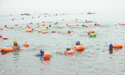 The event in Xingcheng, Northeast China's Liaoning Province, featured a 10-kilometer race across the Xingcheng Strait, from the coastal city to Juehua Island in the Bohai Sea.