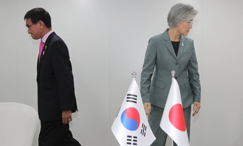 Japanese Foreign Minister Taro Kono (left) and South Korean Foreign Minister Kang Kyung-wha arrive for a meeting on the sidelines of the 52nd ASEAN Foreign Ministers' Meeting in Bangkok, Thailand, on August 1. Photo: IC