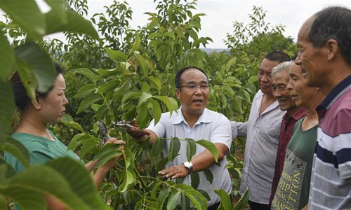 Dong Zhaobin (2nd L), general manager of local agricultural cooperative, explains the field management techniques for the walnut with red kernels as his colleagues listen in Luonan County, Shangluo, northwest China's Shaanxi Province, Aug. 5, 2019. The variety of walnut with red kernels was brought in to Luonan at the end of 2015 and now 1200 mu (80 hectares) of standardized farming demonstration base has been set up to help local low-income families get out of poverty. (Xinhua/Tao Ming)