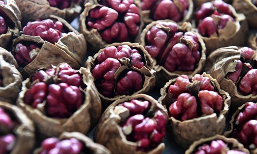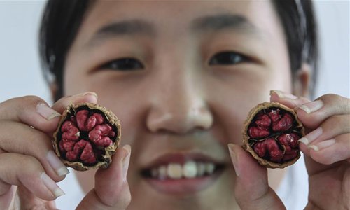 Photo taken on Aug. 5, 2019 shows walnuts with red kernels in Luonan County, Shangluo, northwest China's Shaanxi Province. The variety of walnut with red kernels was brought in to Luonan at the end of 2015 and now 1200 mu (80 hectares) of standardized farming demonstration base has been set up to help local low-income families get out of poverty. (Xinhua/Tao Ming)