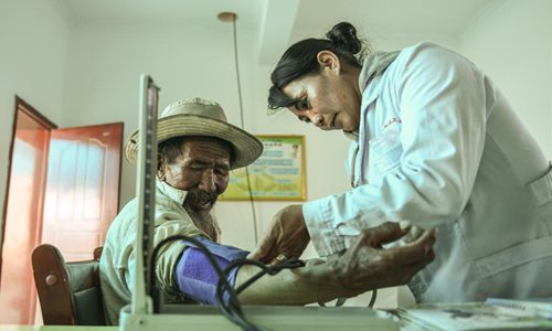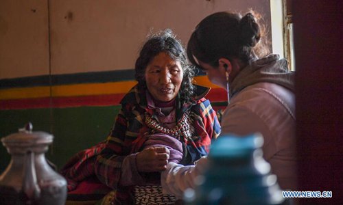 Village doctor Zhoima (R) conducts a medical checkup for a villager at the health room in Wuqang Village of Dongmar Township in Rutog County, Ngari Prefecture, southwest China's Tibet Autonomous Region, Aug. 3, 2019. Born in 1979, Zhoima has been a village doctor in Wuqang for more than 20 years. It is estimated that each year she provides more than 600 diagnoses and treatment to villagers, regardless of the weather and journey. (Xinhua/Jigme Dorje)