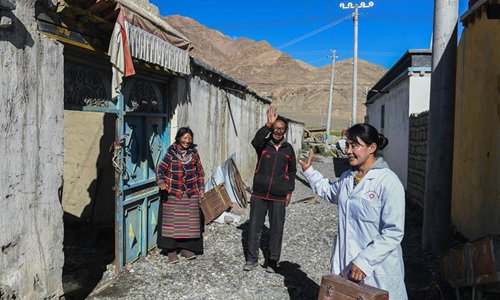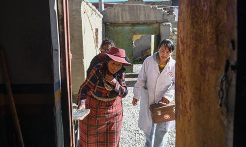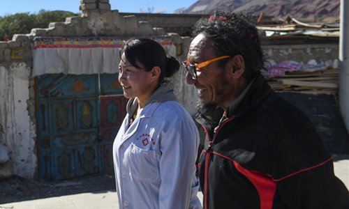Village doctor Zhoima (R) pays a home visit in Wuqang Village of Dongmar Township in Rutog County, Ngari Prefecture, southwest China's Tibet Autonomous Region, Aug. 3, 2019. Born in 1979, Zhoima has been a village doctor in Wuqang for more than 20 years. It is estimated that each year she provides more than 600 diagnoses and treatment to villagers, regardless of the weather and journey. (Xinhua/Jigme Dorje)