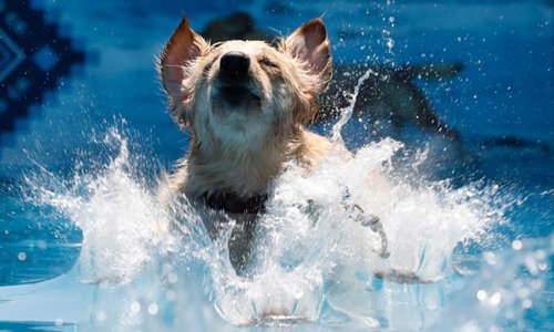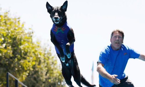 A dog jumps over water in an event at the Santa Clara County Fair in northern California on Aug. 4, 2019. (Photo: China News Service/Liu Guanguan)