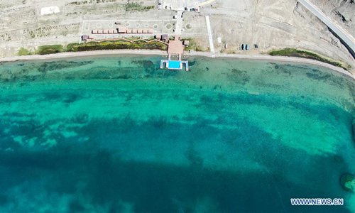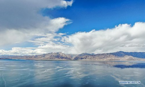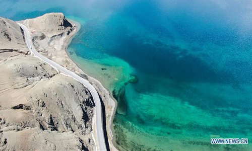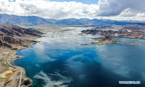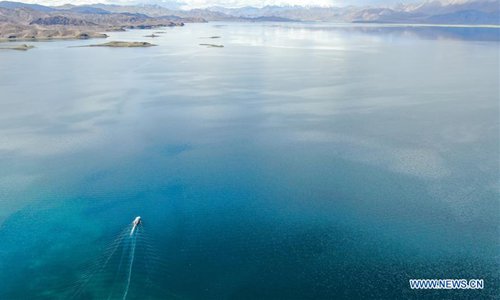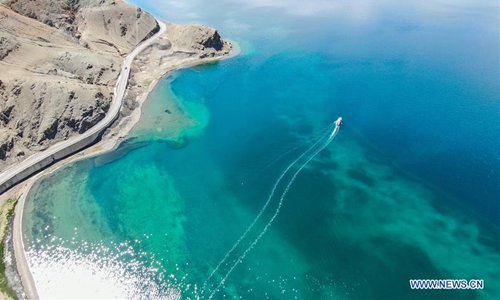 Aerial photo taken on Aug. 3, 2019 shows the Banggong Co in Ngari Prefecture, southwest China's Tibet Autonomous Region. (Xinhua/Jigme Dorje)