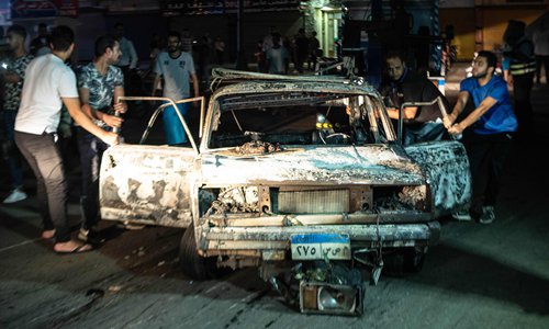 A photo taken early Monday morning shows people surrounding a burned car after an accident that caused an explosion which killed 16 in downtown Cairo. The accident was caused by a speeding car heading in the opposite direction and collided with three other cars, the health ministry said. Photo: VCG