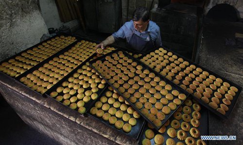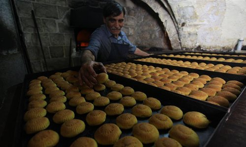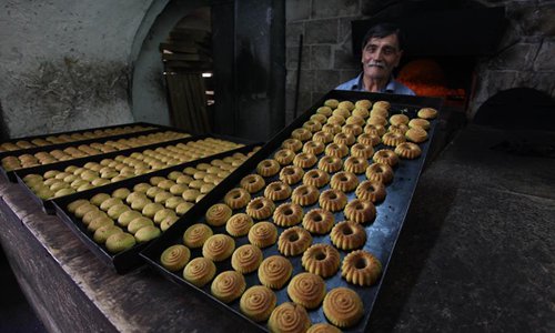 A Palestinian vendor prepares traditional cookies at his shop ahead of Eid al-Adha in the West Bank city of Nablus, Aug. 6, 2019. (Photo by Nidal Eshtayeh/Xinhua)