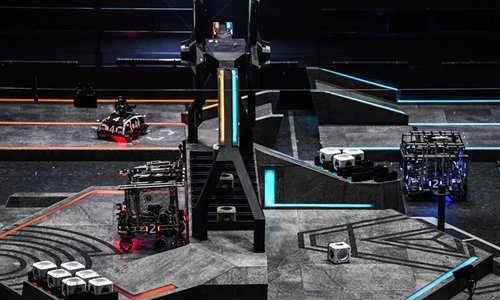Robots compete during the finals of the 18th RoboMaster Robotics Competition in Shenzhen, south China's Guangdong Province, Aug. 6, 2019. The final tournament of the 18th RoboMaster Robotics Competition kicked off here on Tuesday, with 32 teams from home and abroad competing for the championship. (Xinhua/Jin Yu)