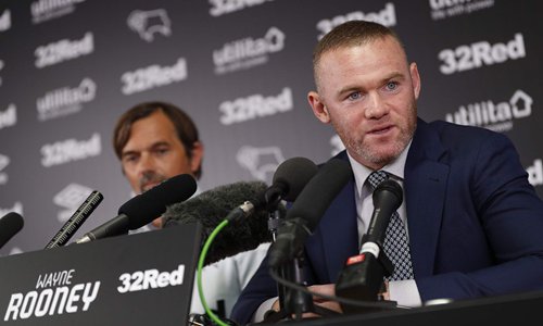Former England captain Wayne Rooney (right), alongside Derby County's Dutch manager Phillip Cocu, answers questions at a press conference in Derby, England on Tuesday. Photo: VCG
