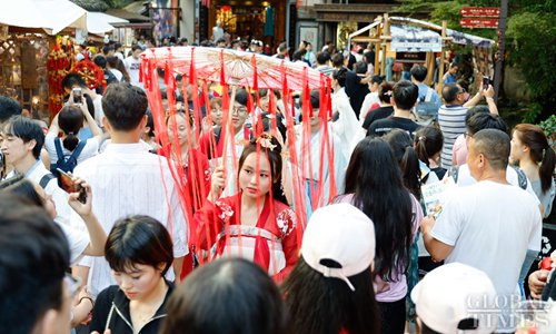 A group of people wearing hanfu celebrate Chinese Valentine’s Day in Jinli, Chengdu, SW China’s Sichuan Province
