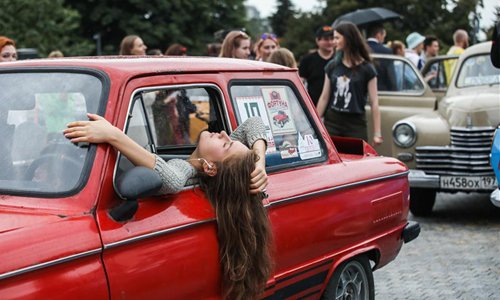 An actress takes part in a street performance in central Moscow, Russia, on Aug. 7, 2019. "Probka Mira", a street performance depicting a traffic jam, took place in Muzeon park of central Moscow on Wednesday. Around 200 actors took part in the performance. (Photo by Maxim Chernavsky/Xinhua)