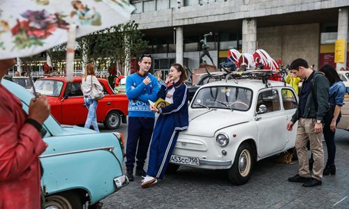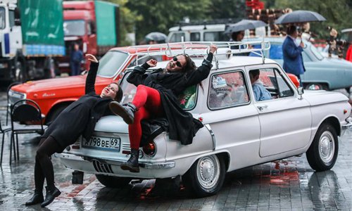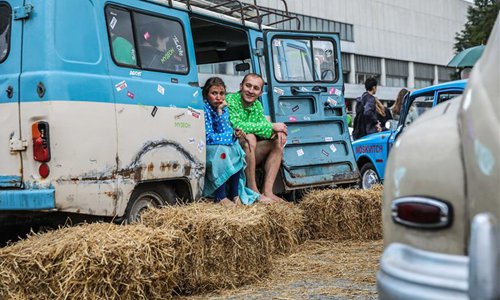 Actors take part in a street performance in central Moscow, Russia, on Aug. 7, 2019. "Probka Mira", a street performance depicting a traffic jam, took place in Muzeon park of central Moscow on Wednesday. Around 200 actors took part in the performance. (Photo by Maxim Chernavsky/Xinhua)
