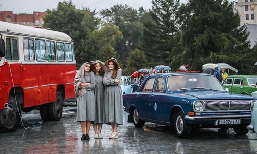 Actresses take part in a street performance in central Moscow, Russia, on Aug. 7, 2019. "Probka Mira", a street performance depicting a traffic jam, took place in Muzeon park of central Moscow on Wednesday. Around 200 actors took part in the performance. (Photo by Maxim Chernavsky/Xinhua)