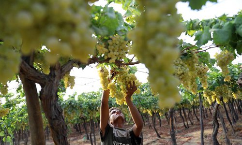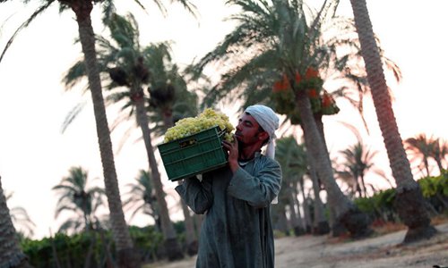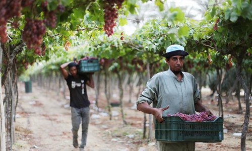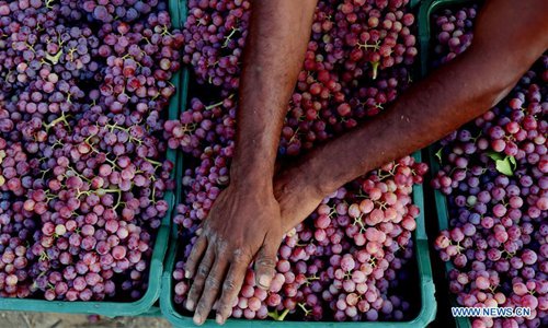 Egyptian farmers harvest grapes in Minufiya Province, Egypt, on Aug. 7, 2019. (Xinhua/Ahmed Gomaa)