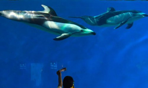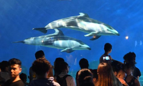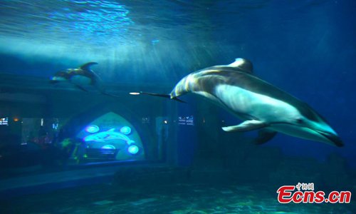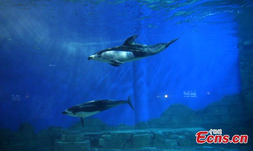 A pair of Pacific white-sided dolphins meet the public at Chongqing’s Andover Ocean Park, Aug. 7, 2019. The species can live up to 30 years on average, and the young pair at the park are just one-and-a-half years old. They are the first Pacific white-sided dolphins to call the city home. (Photo: China News Service/Chen Chao)