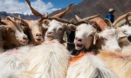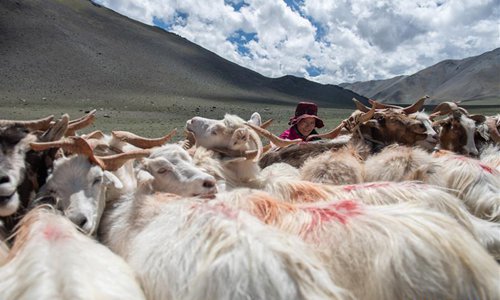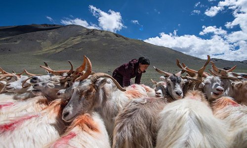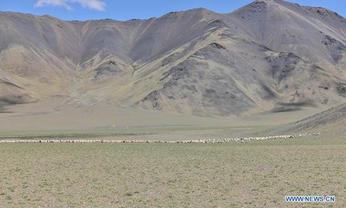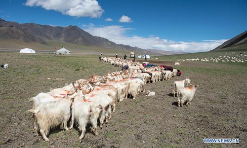 Sheep are seen in Rutog County of Ngari Prefecture, southwest China's Tibet Autonomous Region, Aug. 4, 2019. Summer is a milking season for ewes in the Tibetan pasturing area. Herdsmen here chain up ewes one by one while milking them with buckets in order, a traditional milking way followed by local herdsmen for almost 1,000 years. As an important livestock breeding area in Tibet, Ngari prefecture provides butter, yogurt, beef and mutton to other parts of Tibet. (Xinhua/Jigme Dorje)
