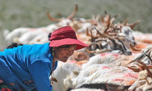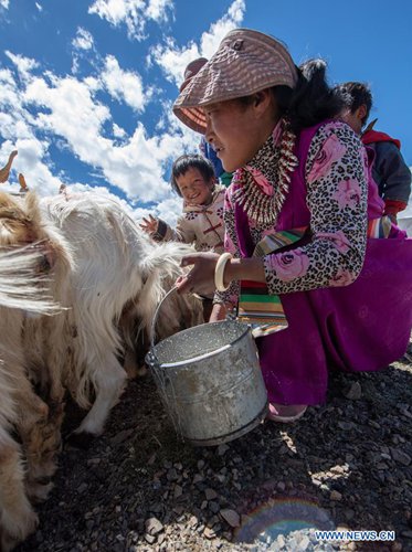 A herdswoman milks sheep in Rutog County of Ngari Prefecture, southwest China's Tibet Autonomous Region, Aug. 4, 2019. Summer is a milking season for ewes in the Tibetan pasturing area. Herdsmen here chain up ewes one by one while milking them with buckets in order, a traditional milking way followed by local herdsmen for almost 1,000 years. As an important livestock breeding area in Tibet, Ngari prefecture provides butter, yogurt, beef and mutton to other parts of Tibet. (Xinhua/Jigme Dorje)