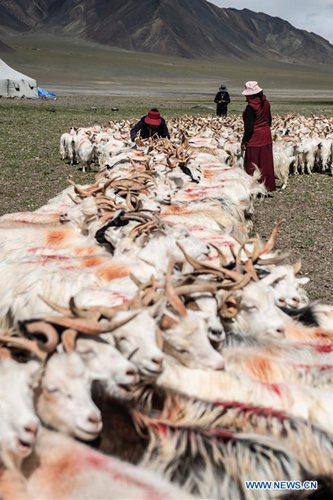 Hundreds of sheep are gathered for milking in Rutog County of Ngari Prefecture, southwest China's Tibet Autonomous Region, Aug. 4, 2019. Summer is a milking season for ewes in the Tibetan pasturing area. Herdsmen here chain up ewes one by one while milking them with buckets in order, a traditional milking way followed by local herdsmen for almost 1,000 years. As an important livestock breeding area in Tibet, Ngari prefecture provides butter, yogurt, beef and mutton to other parts of Tibet. (Xinhua/Jigme Dorje)