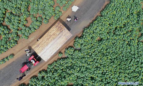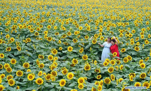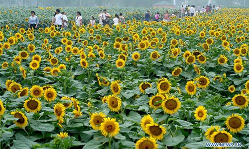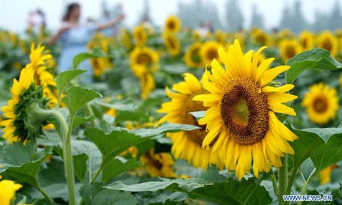 Tourists view sunflowers at a planting base in Shahe, north China's Hebei Province, Aug. 7, 2019. (Photo: Xinhua)