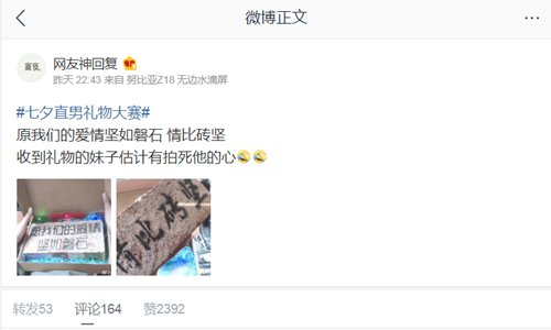 In third place is a gift that comes in a box that contains only a brick printed with the words, "Our love is more solid than a brick." It received 2.606 forwards, comments and likes as of press time. Photo: Screenshot of Sina Weibo