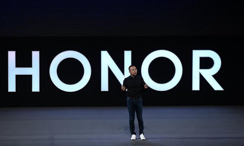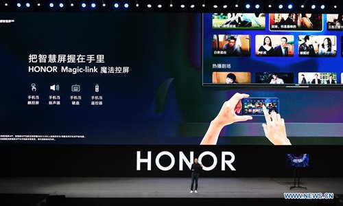 George Zhao, president of Huawei's sub-brand HONOR, unveils HONOR Vision series during the Huawei Developer Conference held in Dongguan, south China's Guangdong Province, Aug. 10, 2019. HONOR Vision is the world's first smart screen equipped with HarmonyOS, or Hongmeng in Chinese, Huawei's open-source operating system. (Xinhua/Liang Xu)