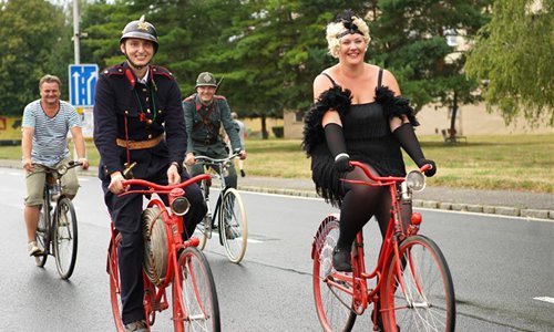 Riders hold a historical bike during a commemorative event in Kutna Hora, the Czech Republic, Aug. 10, 2019. Dozens of cyclists in traditional clothing rode historical bikes and passed through the central Czech city of Kutna Hora on Saturday afternoon to celebrate the 150th anniversary of the first bike race on the Czech land. The first cycling race in Bohemia was said to be held in Kutna Hora on Aug. 8, 1869 on the road between Kutna Hora and Sedlec. (Photo by Dana Kesnerova/Xinhua)