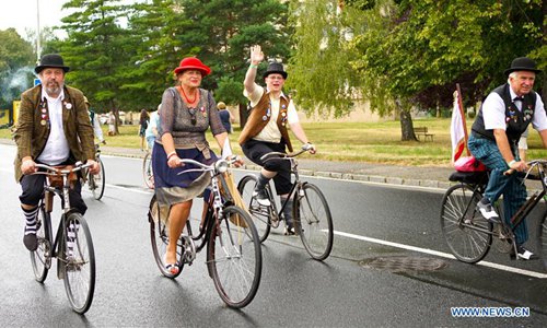 Cyclists take part in a commemorative ride in Kutna Hora, the Czech Republic, Aug. 10, 2019. Dozens of cyclists in traditional clothing rode historical bikes and passed through the central Czech city of Kutna Hora on Saturday afternoon to celebrate the 150th anniversary of the first bike race on the Czech land. The first cycling race in Bohemia was said to be held in Kutna Hora on Aug. 8, 1869 on the road between Kutna Hora and Sedlec. (Photo by Dana Kesnerova/Xinhua)