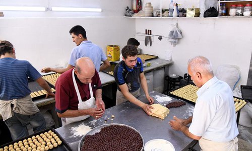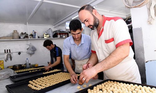 Syrians make date cookies in a sweet shop in Damascus, Syria, on Aug. 8, 2019. Date cookies are traditional sweets for the upcoming Eid al-Adha, or the Feast of the Sacrifice, in Syria. (Photo by Ammar Safarjalani/Xinhua)