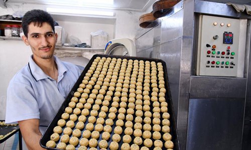 A Syrian sweet maker shows date cookies before putting them in the oven in a sweet shop in Damascus, Syria, on Aug. 8, 2019. Date cookies are traditional sweets for the upcoming Eid al-Adha, or the Feast of the Sacrifice, in Syria. (Photo by Ammar Safarjalani/Xinhua)