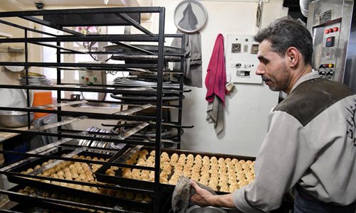 A Syrian sweet maker takes a tray of date cookies out of the oven in a sweet shop in Damascus, Syria, on Aug. 8, 2019. Date cookies are traditional sweets for the upcoming Eid al-Adha, or the Feast of the Sacrifice, in Syria. (Photo by Ammar Safarjalani/Xinhua)