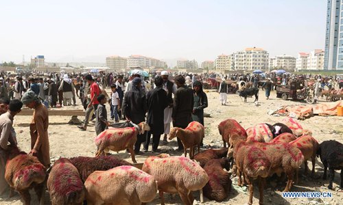 Photo taken on Aug. 10, 2019 shows a livestock market ahead of the annual festival Eid al-Adha in Kabul, Afghanistan. (Xinhua/Rahmatullah Alizadah)