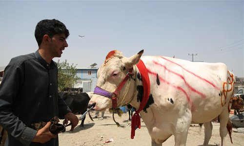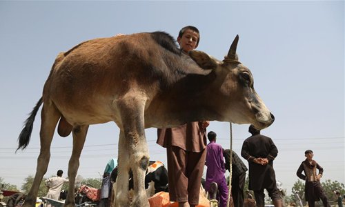 An Afghan vendor waits to sell his cattle at a livestock market ahead of the annual festival Eid al-Adha in Kabul, Afghanistan, Aug. 10, 2019. (Xinhua/Rahmatullah Alizadah)