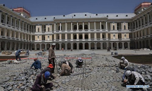 Workers pave the ground of the Darul Aman Palace under reconstruction in Kabul, capital of Afghanistan, Aug. 8, 2019. The reconstructed Darul Aman Palace with white and yellow color, located on a hilltop in the western edge of Kabul, will reopen its gate to the public later this month, as the capital city is under tense reconstruction to change its war-battered face. (Xinhua/Rahmatullah Alizadah)