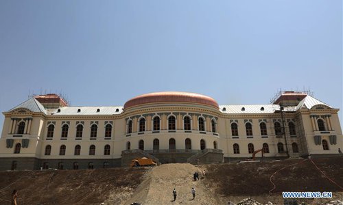 Photo taken on Aug. 8, 2019 shows the Darul Aman Palace under reconstruction in Kabul, capital of Afghanistan. The reconstructed Darul Aman Palace with white and yellow color, located on a hilltop in the western edge of Kabul, will reopen its gate to the public later this month, as the capital city is under tense reconstruction to change its war-battered face. (Xinhua/Rahmatullah Alizadah)