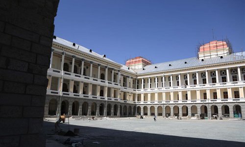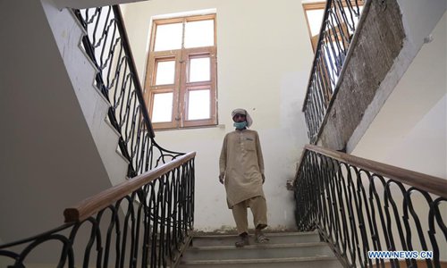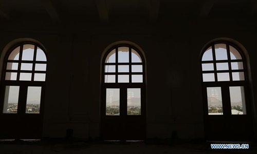 An Afghan worker walks inside the Darul Aman Palace in Kabul, capital of Afghanistan, Aug. 8, 2019. The reconstructed Darul Aman Palace with white and yellow color, located on a hilltop in the western edge of Kabul, will reopen its gate to the public later this month, as the capital city is under tense reconstruction to change its war-battered face. (Xinhua/Rahmatullah Alizadah)