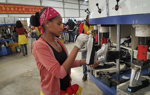 A female worker makes shoes in Huajian Light Industrial City in Ethiopia in January 2017. Photo: IC