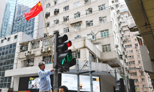 A Hong Kong resident puts up a Chinese national flag at a traffic intersection in Sham Shui Po area on Sunday. Photo: AFP