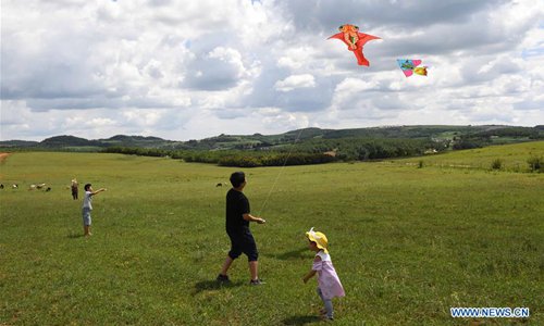 Tourists fly kites at Beidaying Grassland in Hekou Town of Xundian Hui and Yi Autonomous County, southwest China's Yunnan Province, Aug. 10, 2019. (Photo: Xinhua)